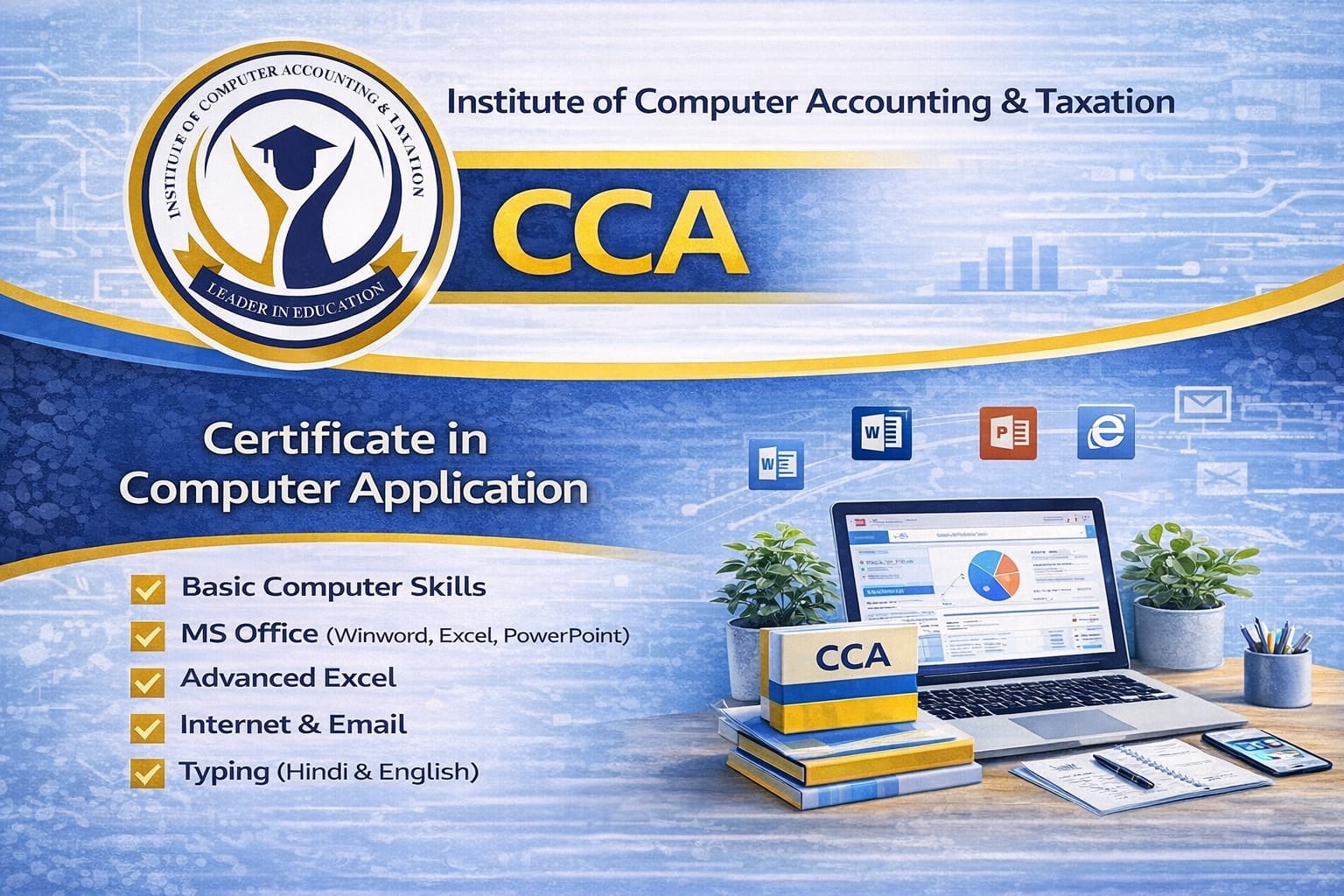 INSTITUTE OF COMPUTER ACCOUNTING & TAXATION Pvt Ltd welcomes you to the world of Professional Computer Courses, which provides the Competence ability to you in the computer field. If you are a Graduate, Diploma holder or educated person in any stream, knowledge of computer can assure your future. INSTITUTE OF COMPUTER ACCOUNTING & TAXATION is the reputed institution guides you to accomplish your career very successfully with the support of many NGO and well instituted Government Supported Organizations inIndia. Besides of that, World Association for Online Education supports our institution for web based learning.